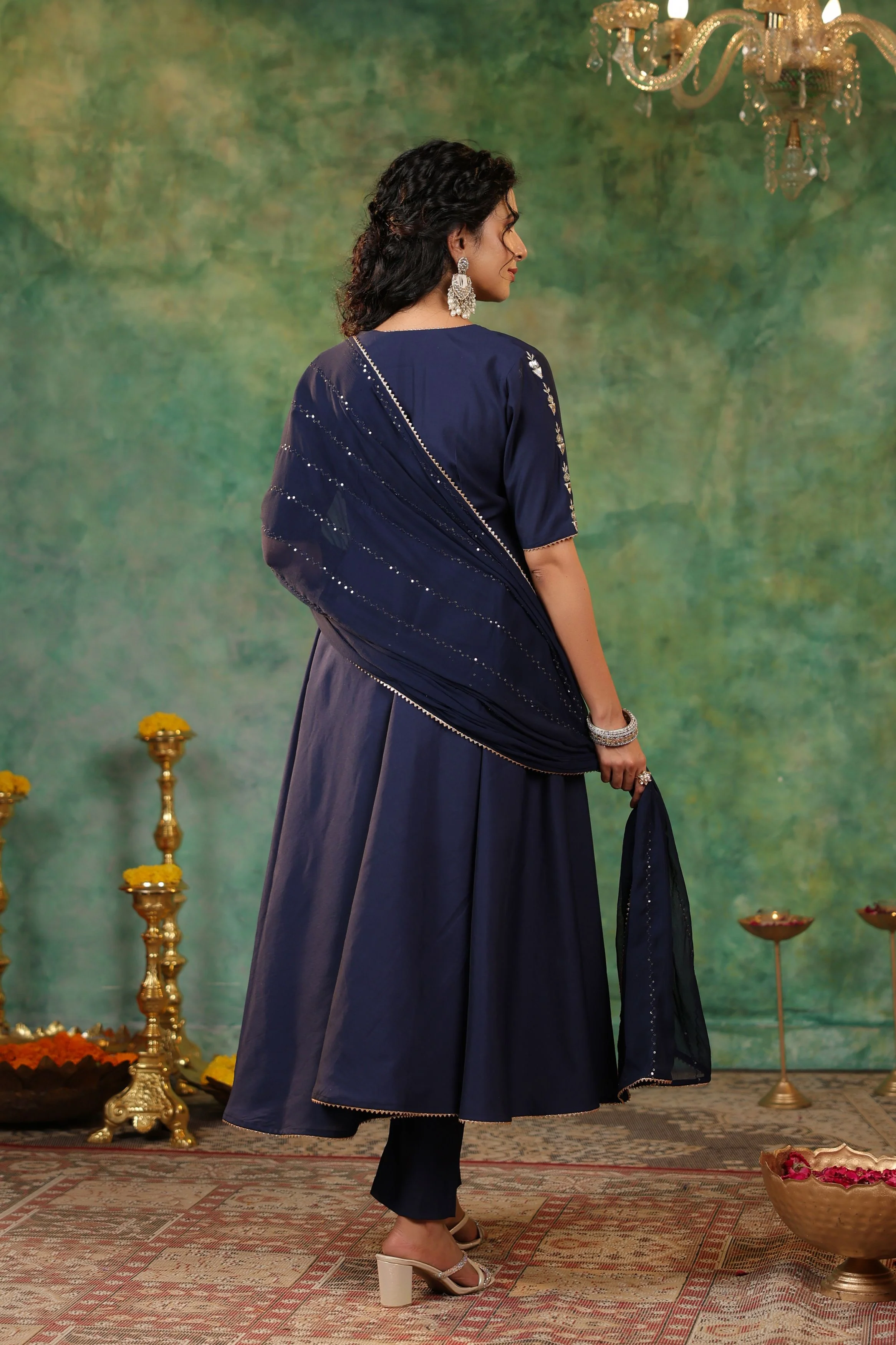 | Kurta Style | Angrakha style imitation Silk kurta embellished with mirror work embroidery and beeja. Sleeves embellished with embroidery on centre line. |