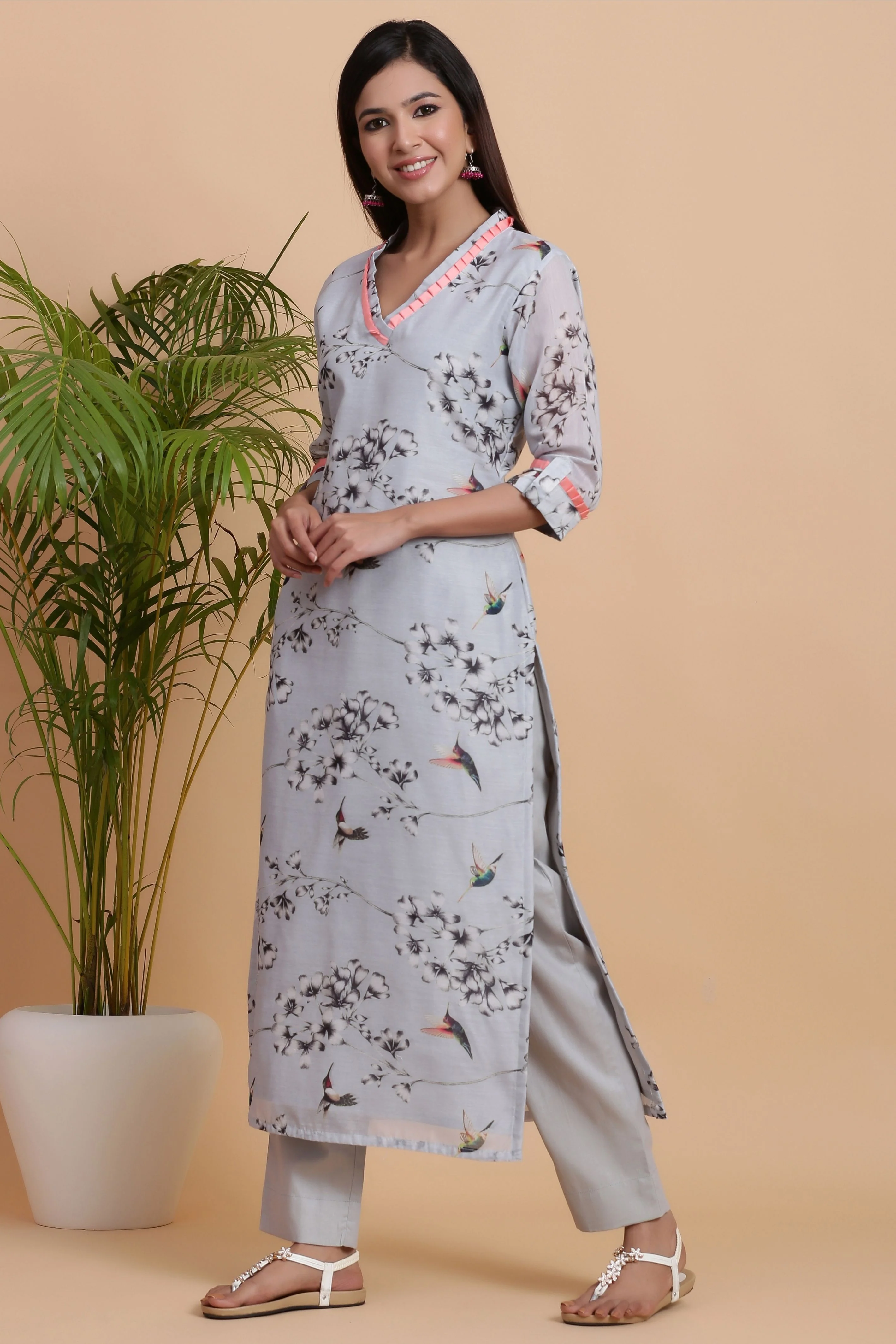 Ash Grey Chanderi Kurta with Pant set - the perfect combination of style and comfort. This gorgeous set features a digitally printed Ash Grey floral Chanderi Kurta with Cotton Pencil Pant, V Neck with ruffled placket neckline, and 3/4th Sleeves. Crafted from the finest Chanderi fabric, this set is lightweight and breathable, perfect for any occasion. The classic Ash Grey colour adds to the overall appeal of this timeless set. Whether you're going for a casual or formal look, this grey kurta set is sure to make you look and feel your best.