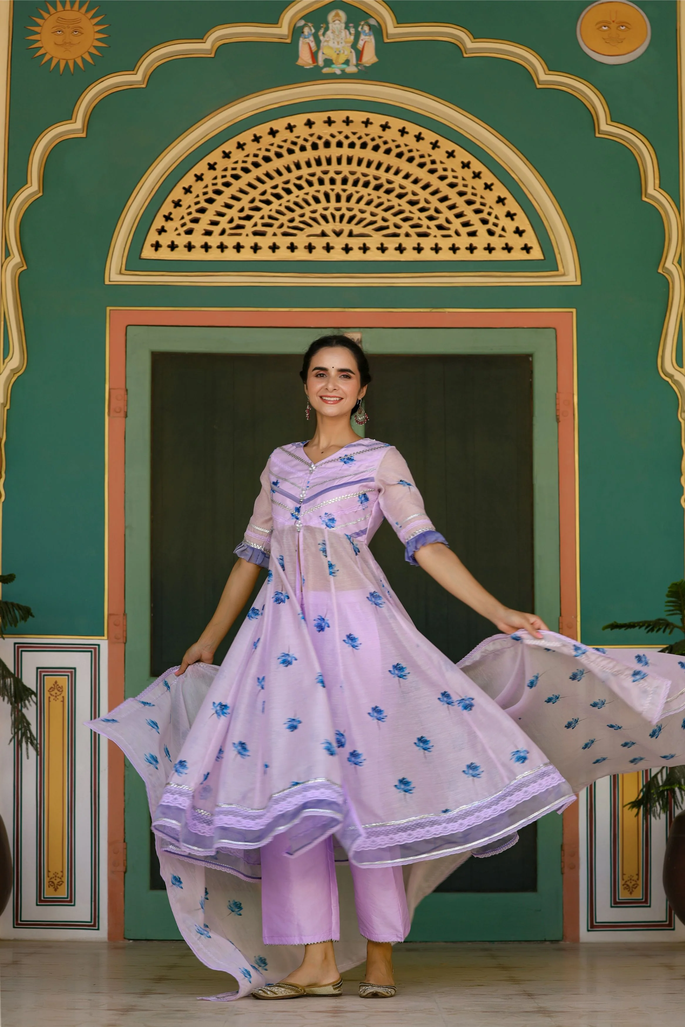 Discover the perfect blend of comfort and style with the Aster Lilac Chanderi Suit Set. This set includes a kurta, palazzo and dupatta, all crafted from luxurious Cotton Chanderi fabric for a lightweight feel. The kurta features an eye-catching kalidaar design with organza and lace detailing on the hemline and sleeves, finished with shimmering silver trims and fancy buttons on the front yoke. The upper body also features a premium cotton lining for extra comfort.This exquisite set from cotton suit sets online collection is sure to make you stand out from the crowd!