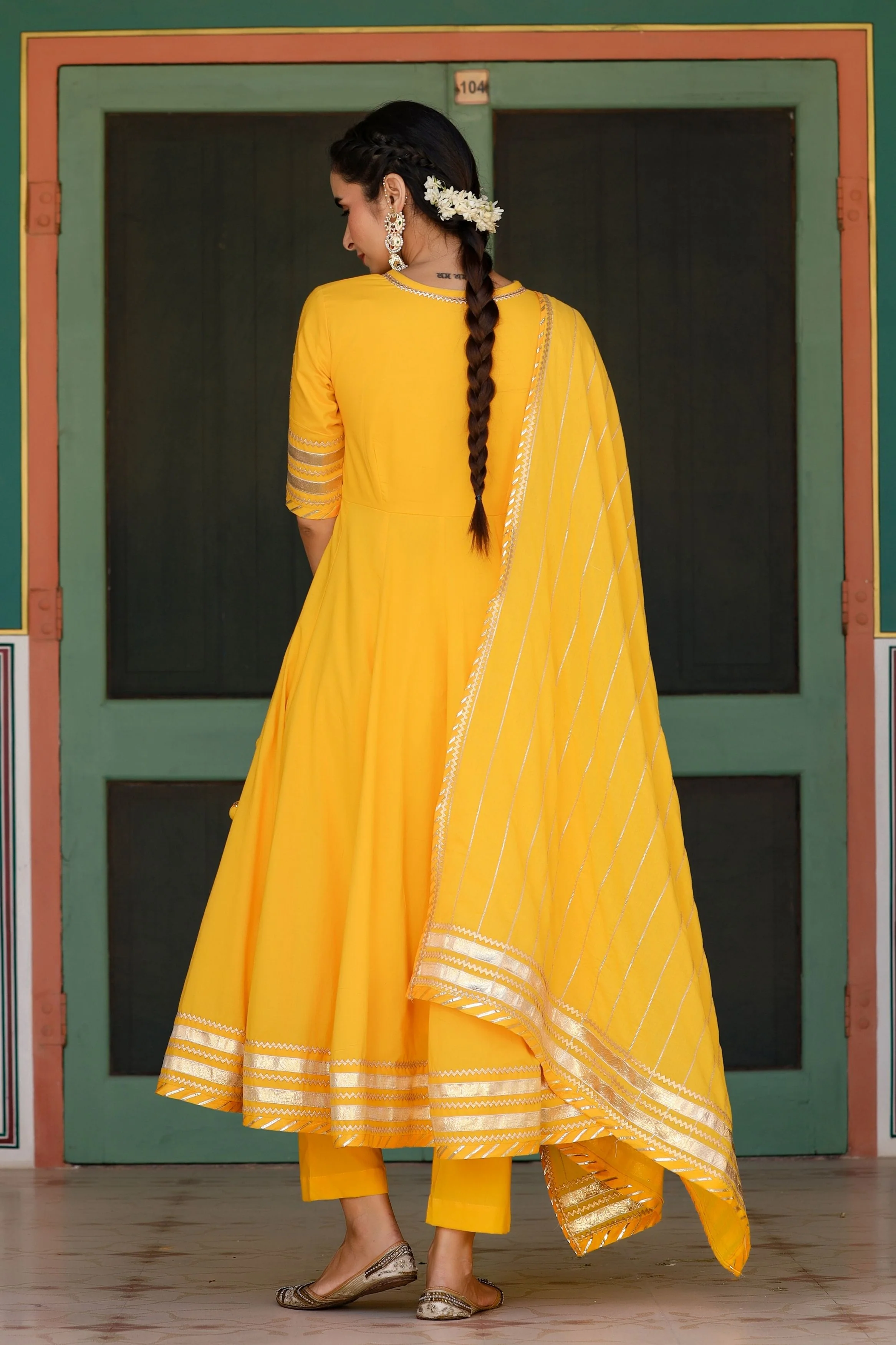 | Kurta Style | Angrakha Style Pure Cotton Flared Kalidar Kurta. Embellished with Gota Patti handwork and Dori Tassels. Magzi and Gota borders on Hemline. |