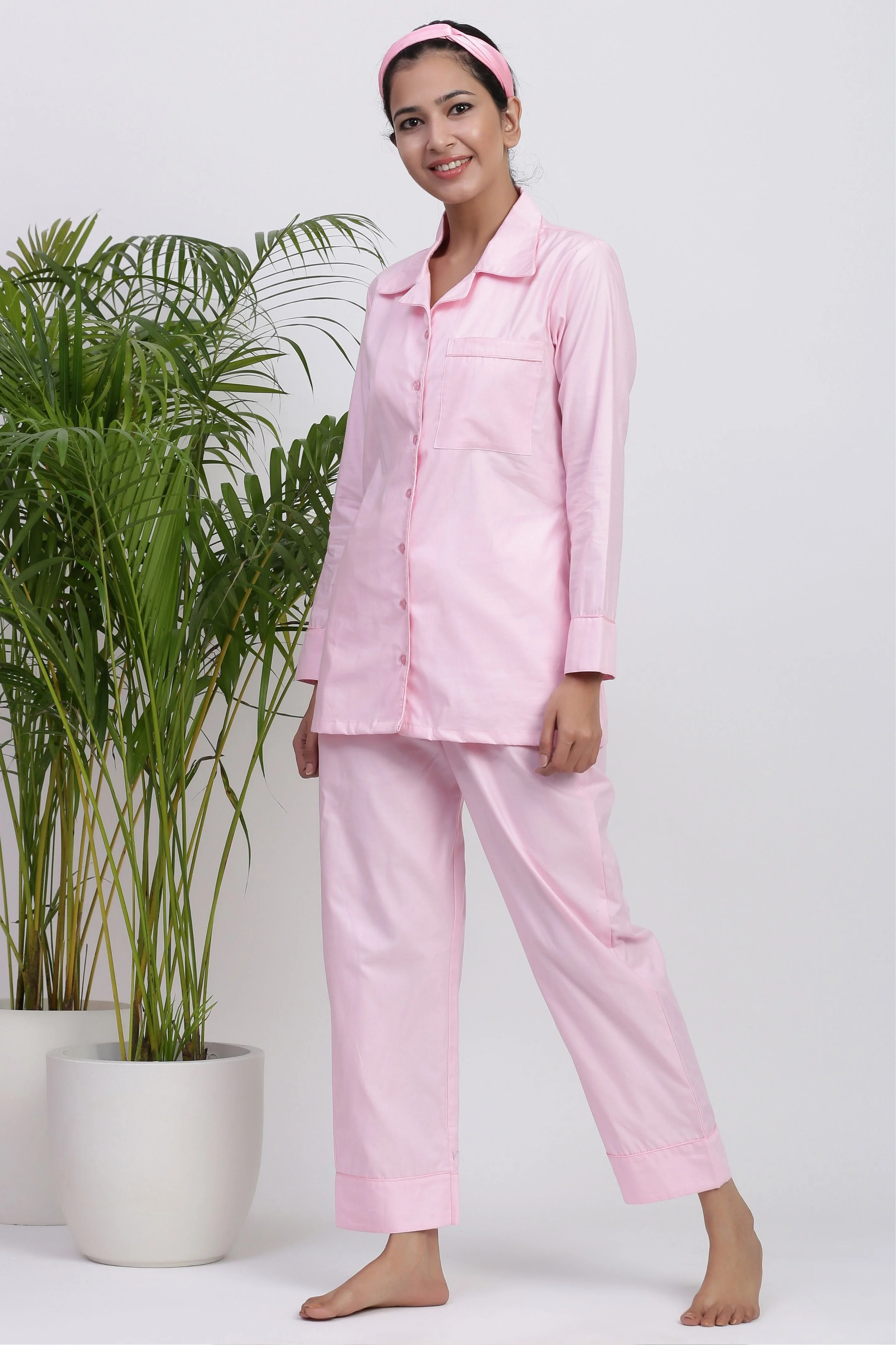 This classic Pure Egyptian Blush Pink Nigh-Suit is everyone's all-time favorite. A button-down collared shirt with a Satin Cord finish gives a rich feel. Super comfortable Payjama with pocket is just perfect for all-day lounging. Complete the look with a matching knotted Headband. When it comes to washing care, you have to hand wash them separately in cold water to retain the fabric's shine and comfort.