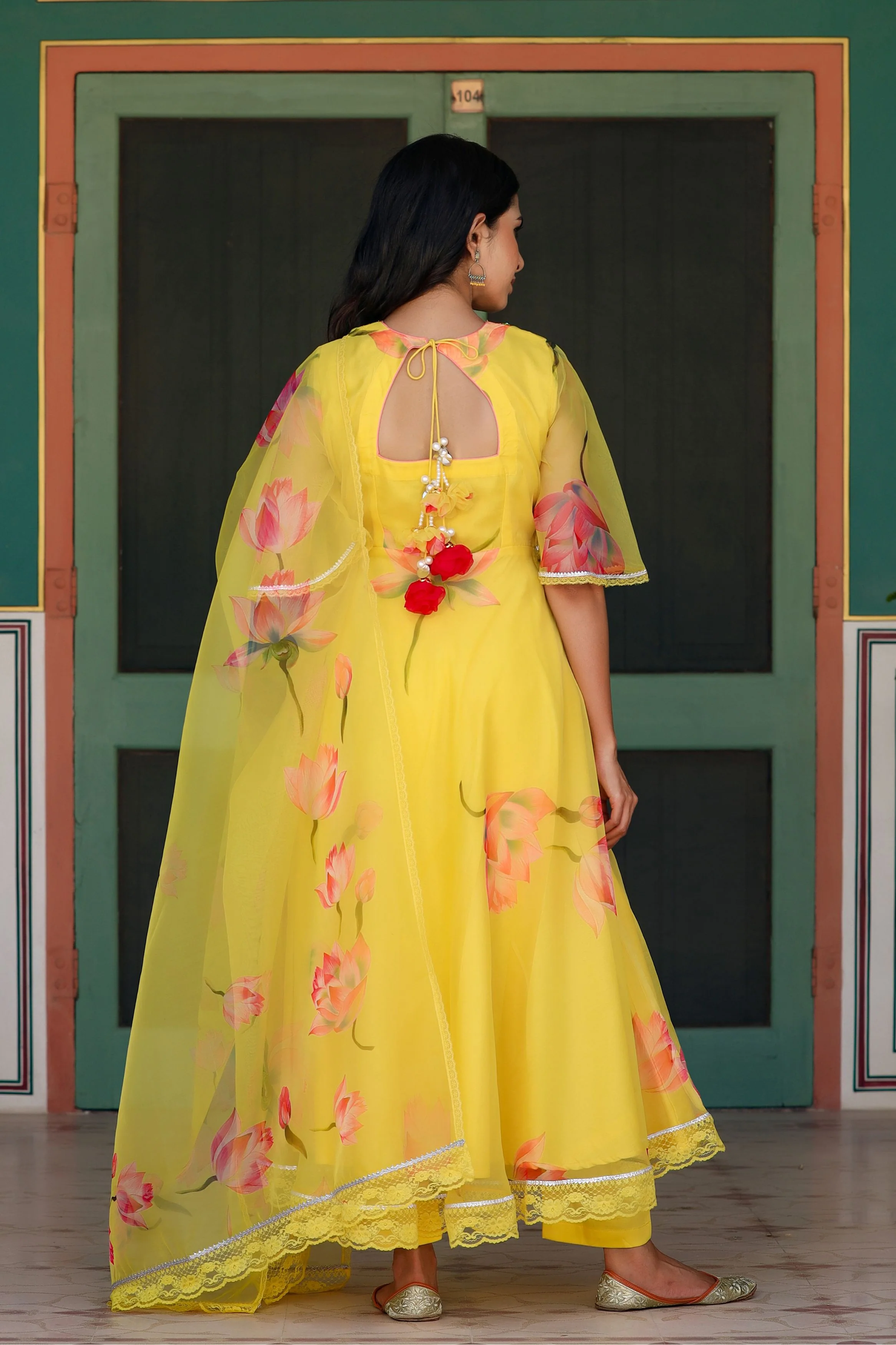 | Kurta Style | Organza flared kurta with sequence work on neckline. Hemline finished with gota and net lace. Designer key hole back with fancy tassels. |