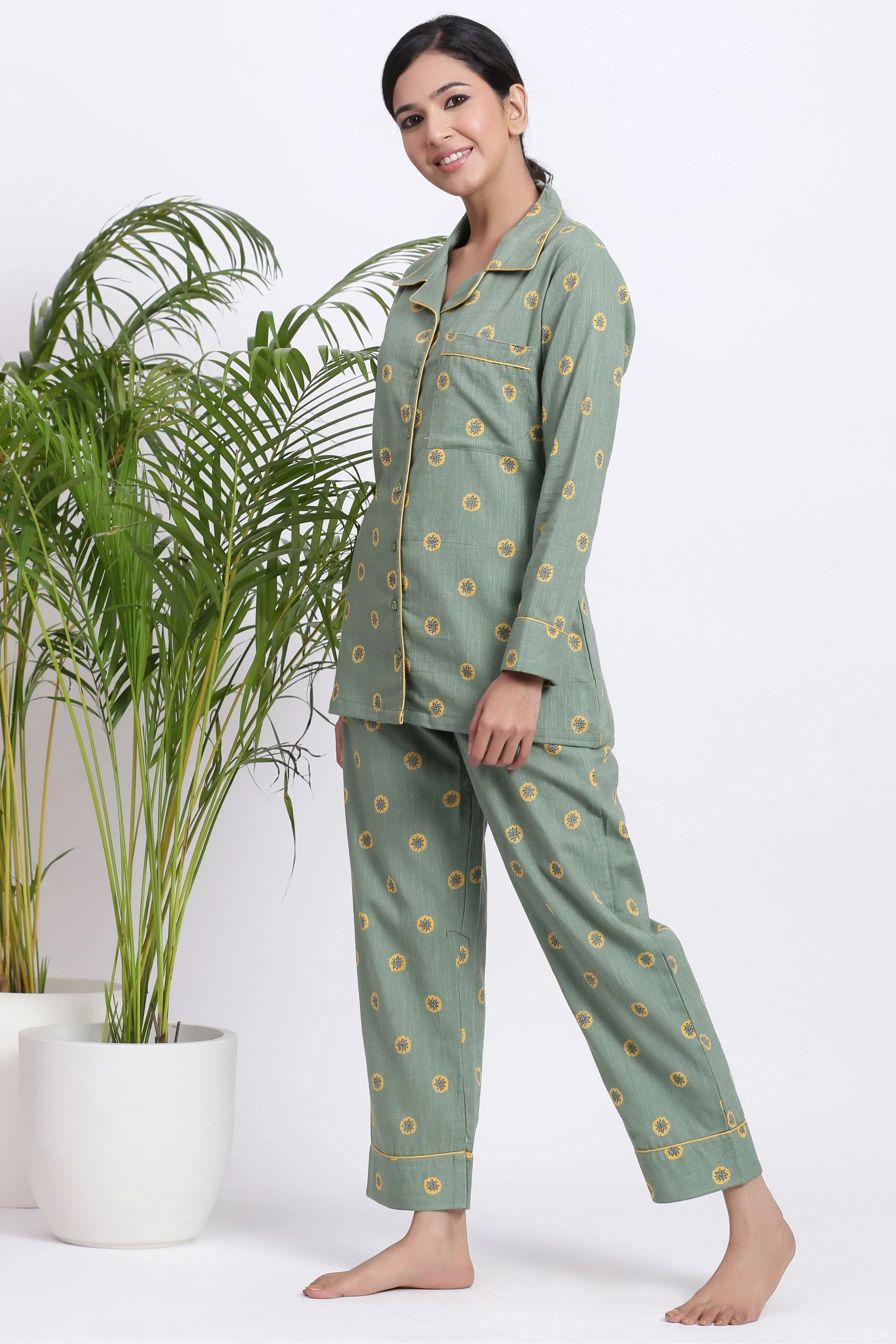 Relax all day long in unrivalled comfort with our luxurious Citrus Zest Loungewear Set. This stylish set is perfect for the modern woman who wants to look and feel her best. The top and bottom are made of 100% cotton, ensuring a comfortable and breathable fit that won't make you overheat. It is easy to maintain with a simple hand wash in cold water and should be dried in the shade. So, if you're looking for a comfortable and stylish set, the Citrus Zest Loungewear Set is a perfect choice.