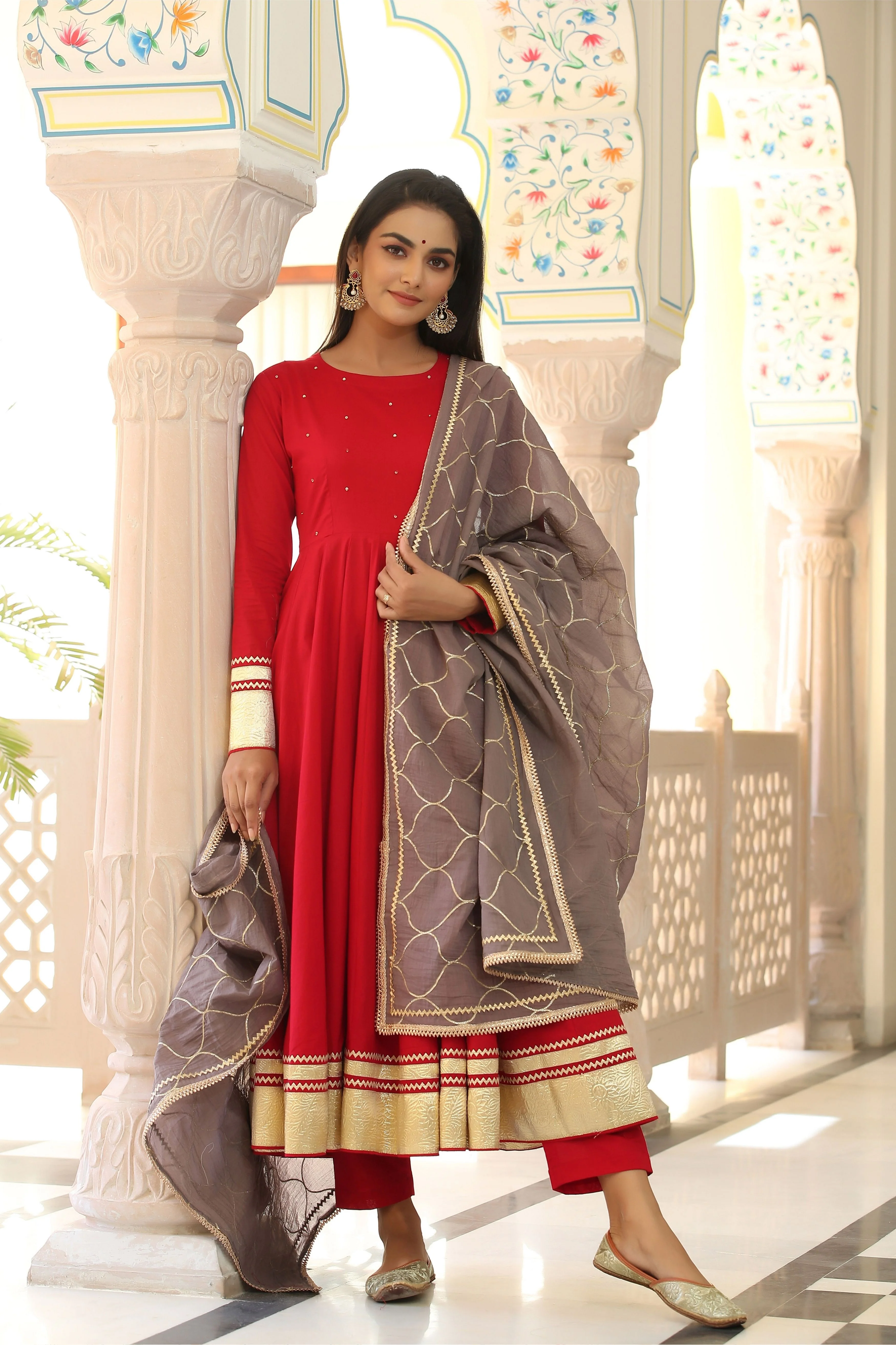 Gulnaaz Anarkali with Dupatta is the perfect choice for a statement-making look. This anarkali suit set is crafted with super soft cotton, featuring a full flared long Kalidar Kurta with zero neckline, full sleeves, pencil pant, and a fine Gota Mughal Jaal work on the dupatta. The neckline is adorned with intricate Gota border and the bottom hem and sleeves are sequenced with intricate Gota border. The dupatta is made from super fine cotton and will be sure to turn heads. This anarkali kurta set with dupatta set is the perfect choice for a glamorous and sophisticated look.