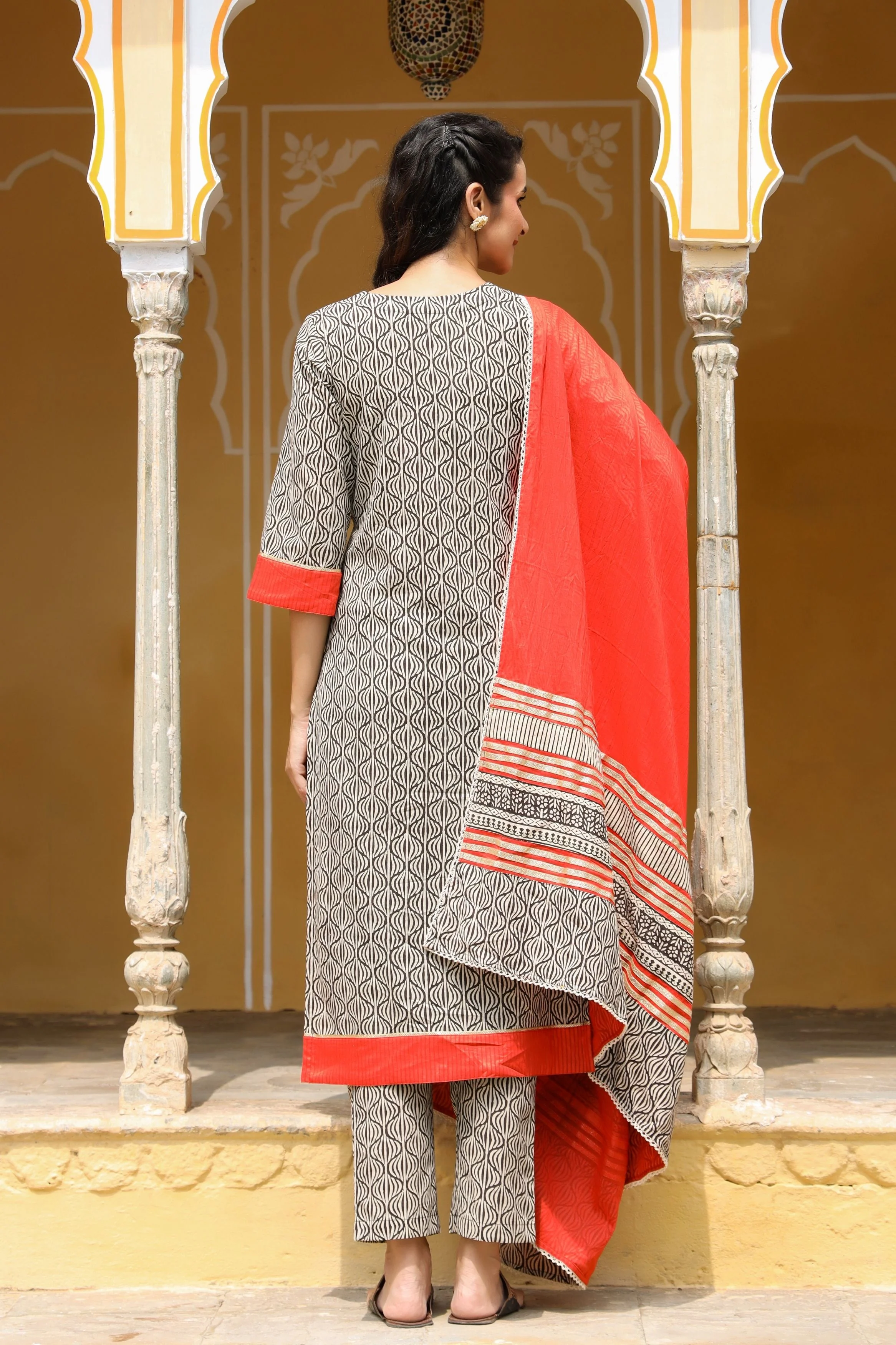 Our Kurta Pant suit sets with dupatta is made from pure cotton hand-block printed in Bagru, with a fancy button placket. The straight pants are the perfect accompaniment to the Kurta, and the Rust Orange Pure Mulmul dupatta adds an extra bit of vibrancy to the ensemble. The dupatta is adorned with gota and border placements on the pallu, as well as fancy wooden buttons and thread embroidery on the placket. This is sure to become your go-to for special occasions and family gatherings for years to come.