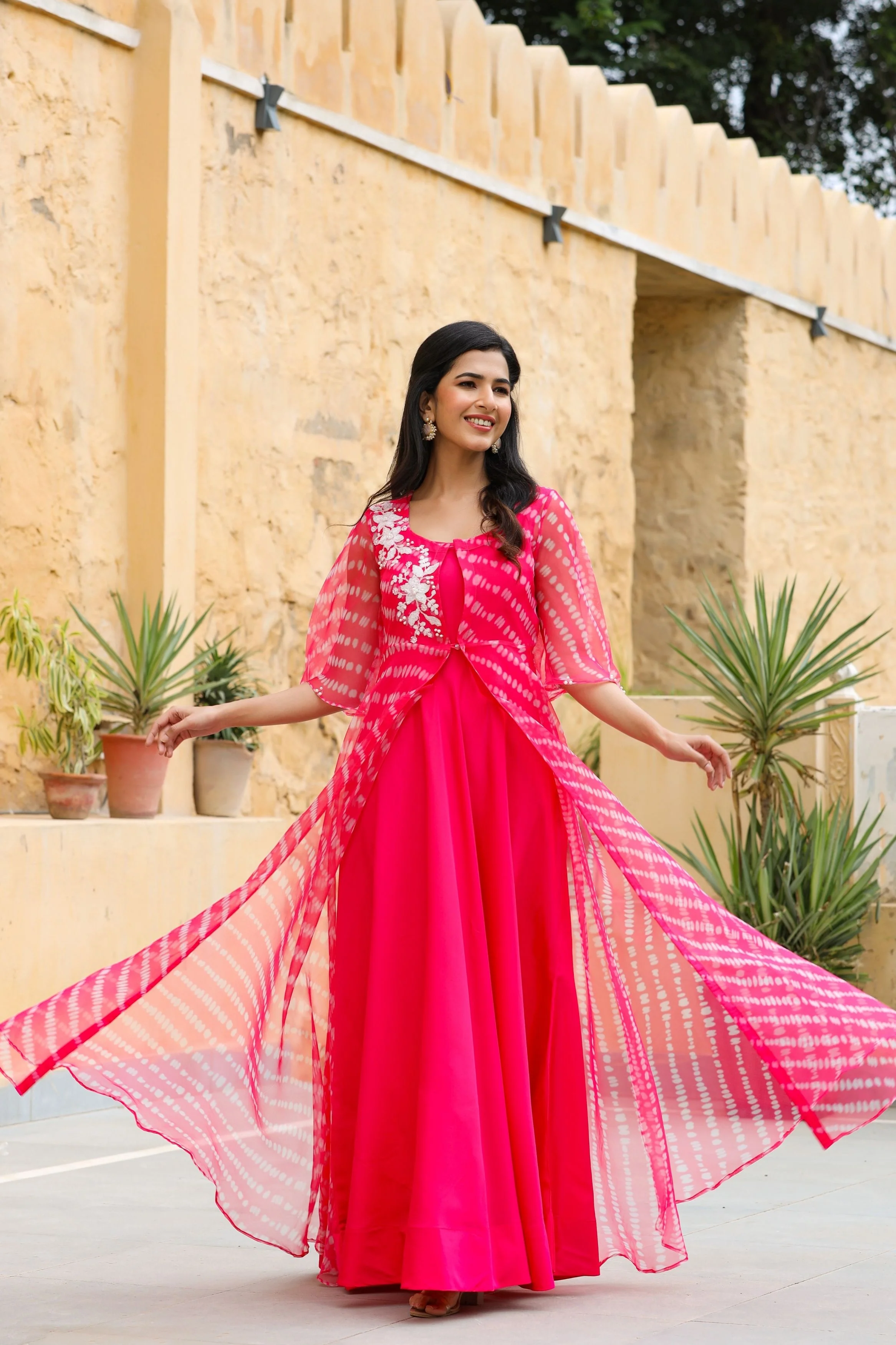 Look your best at any event with Hot Pink Layered Dress! This jacket dress has a perfect blend of ethnic and modern looks. Whether you're attending a festival, a party, or a wedding, this dress is sure to turn heads. It features a stylish organza jacket and an Egyptian cotton inner, giving it a perfect fall and shape. The pearl and sequin work adds a touch of elegance, making it perfect for any event. It is the ideal combination of ethnic and modern looks, giving you a unique and eye-catching look. With the Hot Pink Layered Dress, you can be sure to look your best.