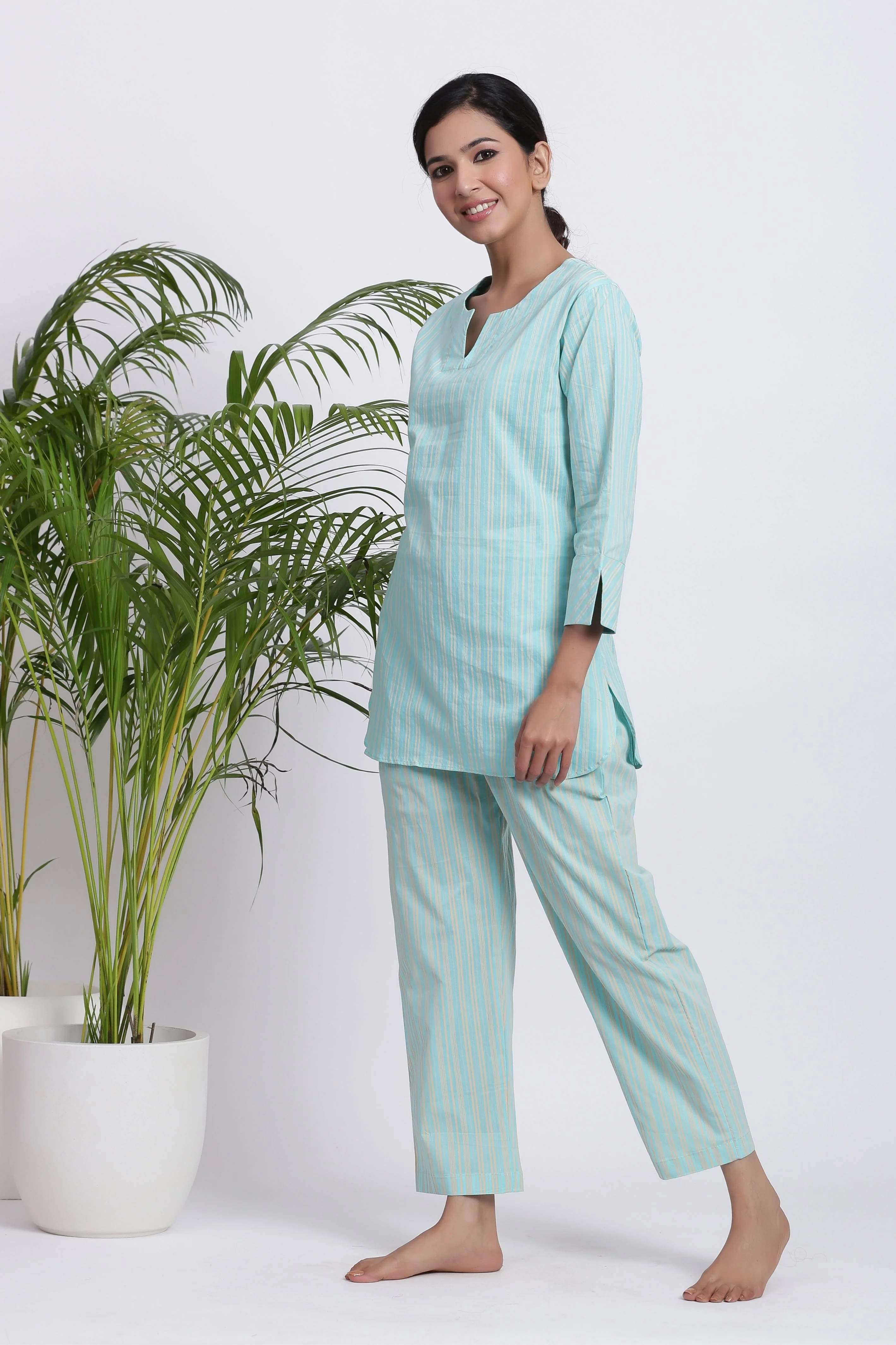 Looking for trendy & comfy cotton night suit sets? This Minty Stripes Cotton Set is the perfect addition to your wardrobe. Made from 100% cotton fabric, this night suit set is ideal for sleepovers or just lounging around the house. The soft and lightweight cotton fabric is breathable and comfortable, perfect for warm summer nights. The striking mint hue and white stripes add a fun and stylish twist. The set comes with a top and matching bottoms for a complete look.