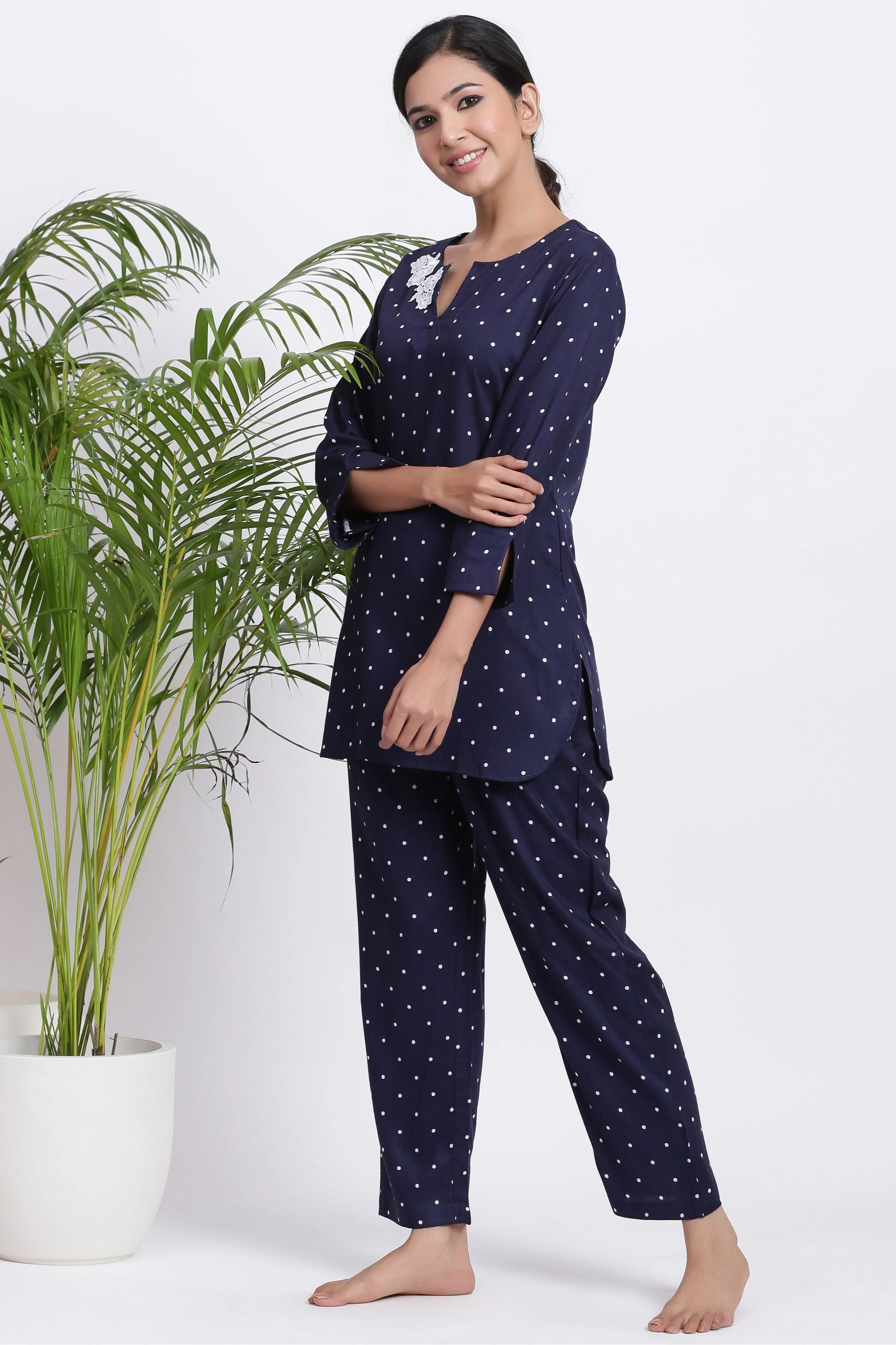 Our Playful Polka Loungewear Set is essential for everyday lounging. The charming polka print adds a fun touch of personality. Whether you're looking for something comfortable to wear while watching movies or to just relax at home, this rayon loungewear set provides the perfect combination of function and style. The rayon fabric is breathable and durable, making it an ideal choice for any day of the week. Enjoy the playful and comfortable vibes of our loungewear set, and make it your go-to piece when you want to relax.