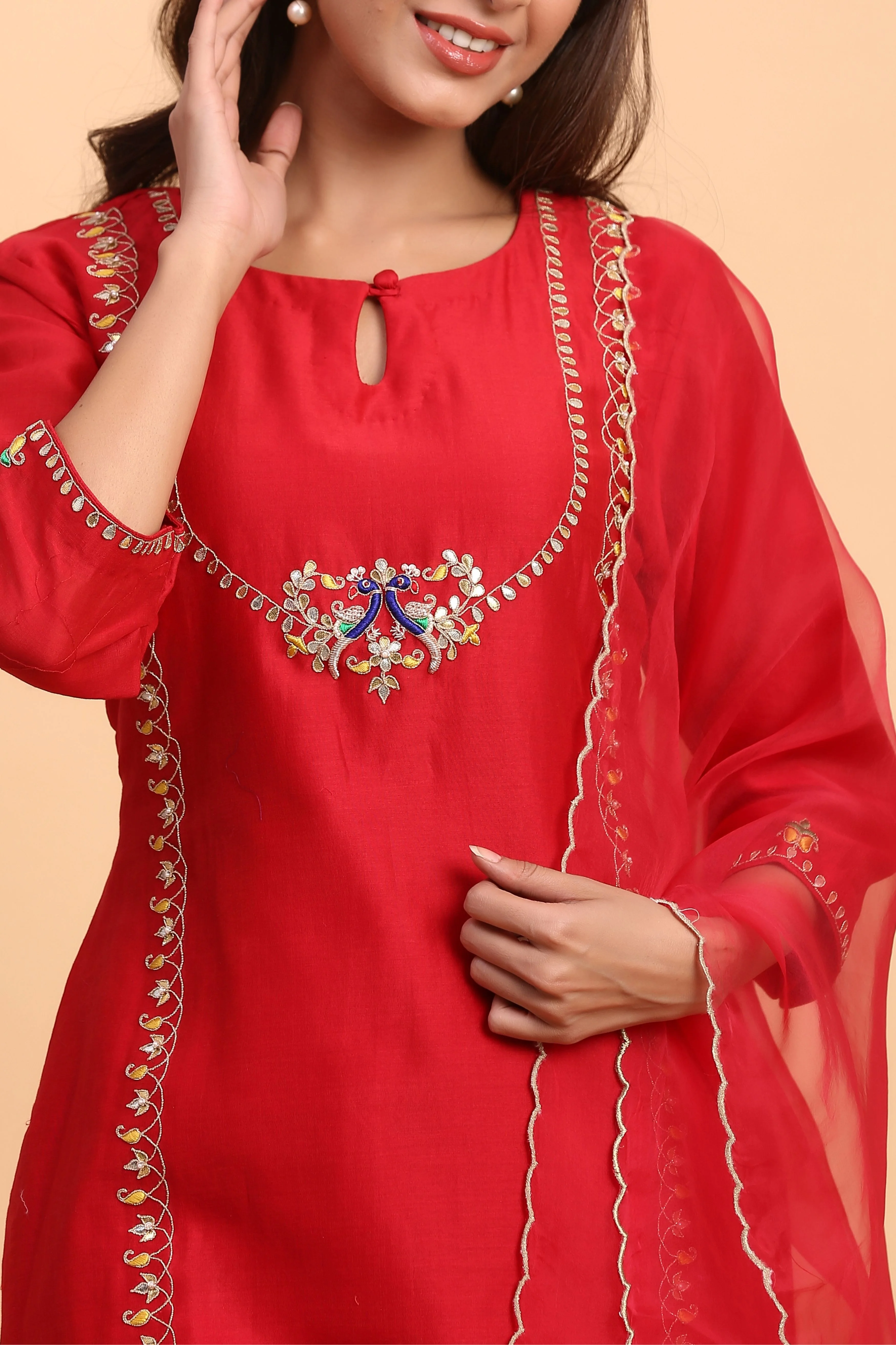 Showcase your unique style with the Gillori Gulmohar Chanderi Suit Set. It is an exquisite blend of pure chanderi kurta and cotton satin pencil pants with a beautiful pure organza all-side scalloped dupatta. The kurta is hand-embroidered with a stunning peacock motive and adorned with intricate Gota Patti handwork. The 3/4th sleeves also feature Gota Patti handwork border. This stunning suit set is perfect for special occasions, weddings and festivals.
